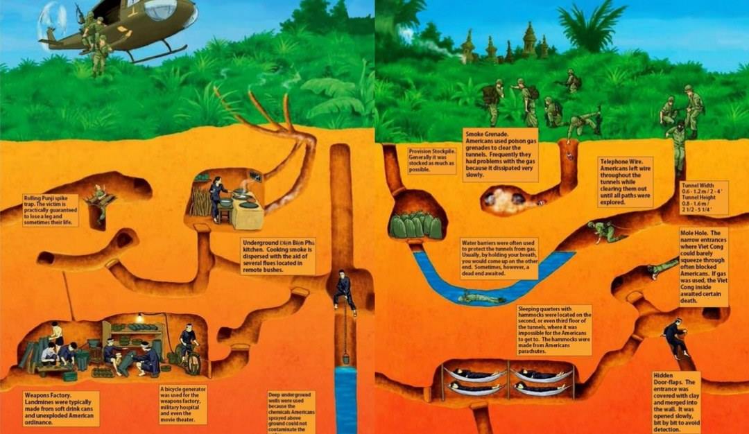 The Cu Chi Tunnels stretch over 250km, with three levels of varying depths. The first level is 3 meters deep, the second 6 meters, and the deepest reaches 12 meters. Built from laterite clay, the tunnels have a solid structure, making them resistant to landslides. The deepest level, at 12 meters, was capable of withstanding heavy attacks, including bombs, artillery shells, and even armored vehicles. The tunnels were also connected to a water well system to meet daily living needs, and the camouflaged tunnel covers kept the system safe from fierce attacks by the U.S. army.